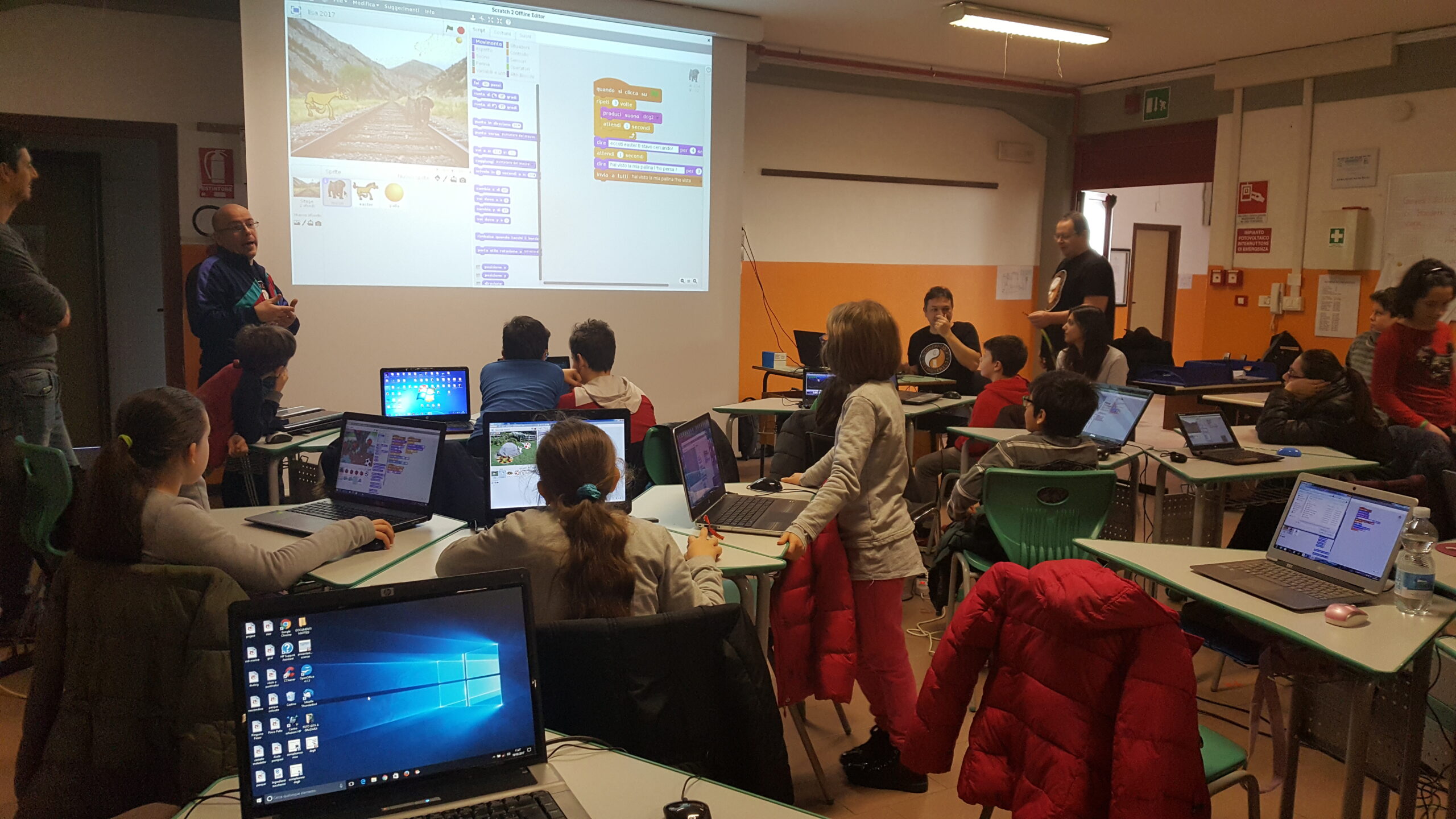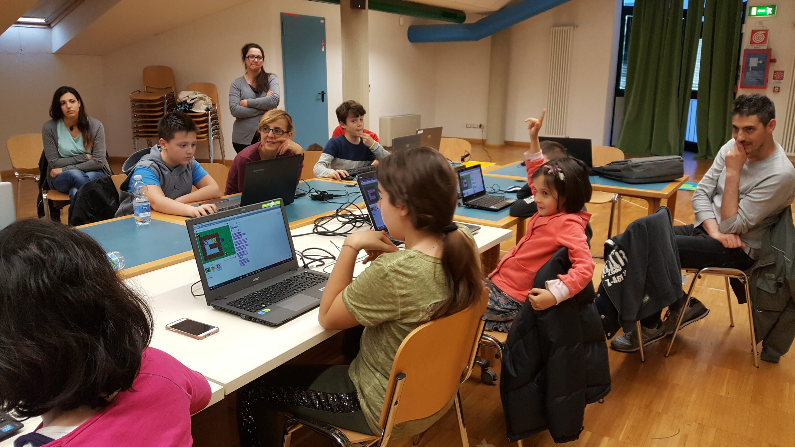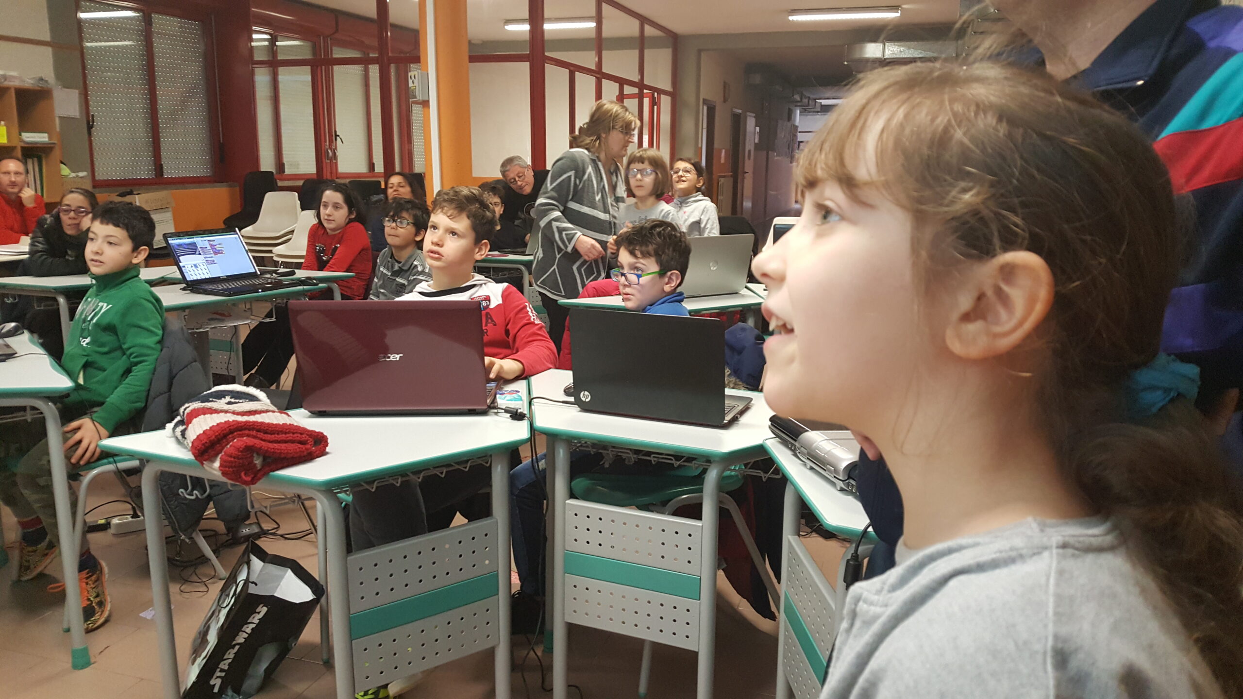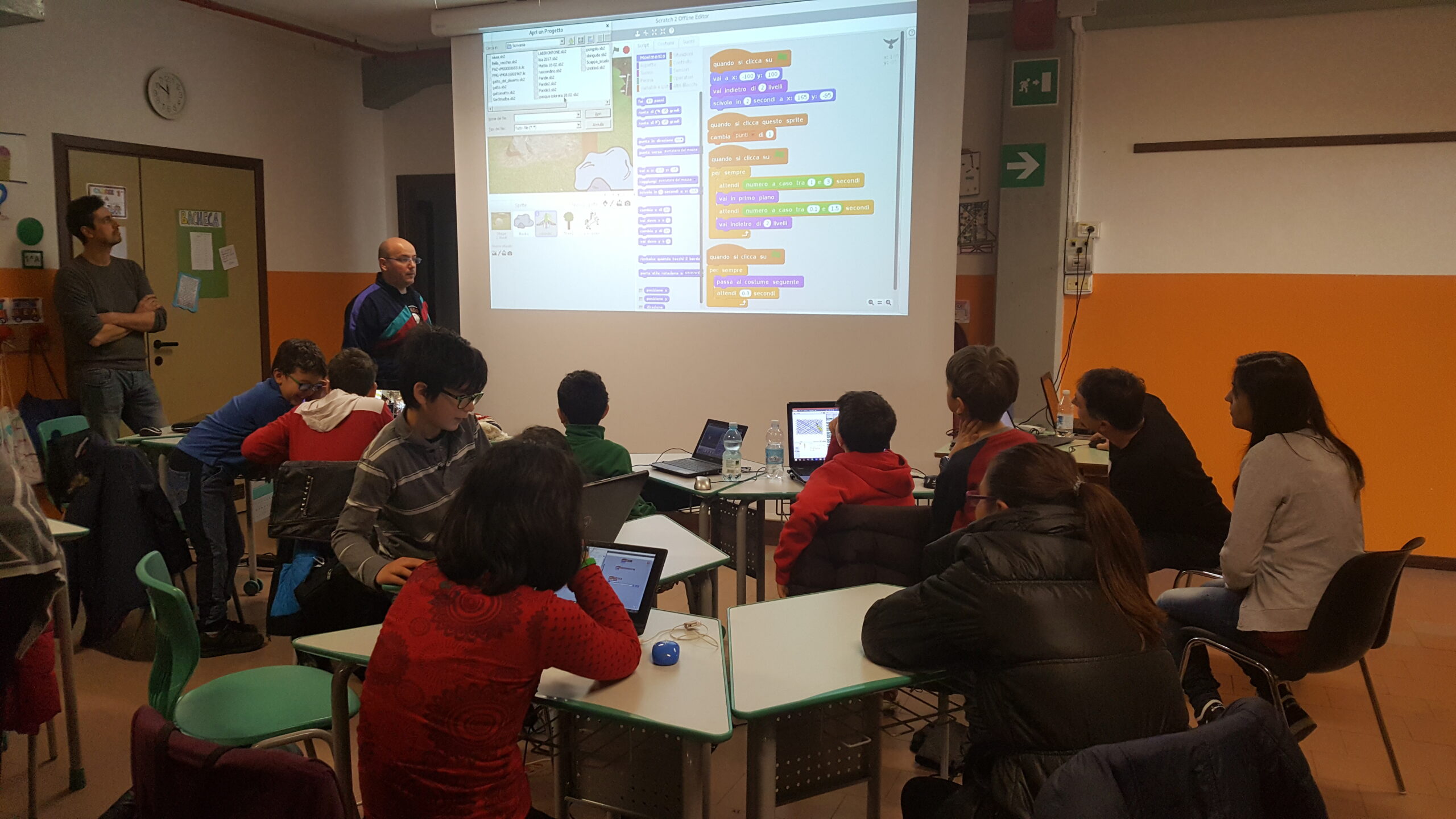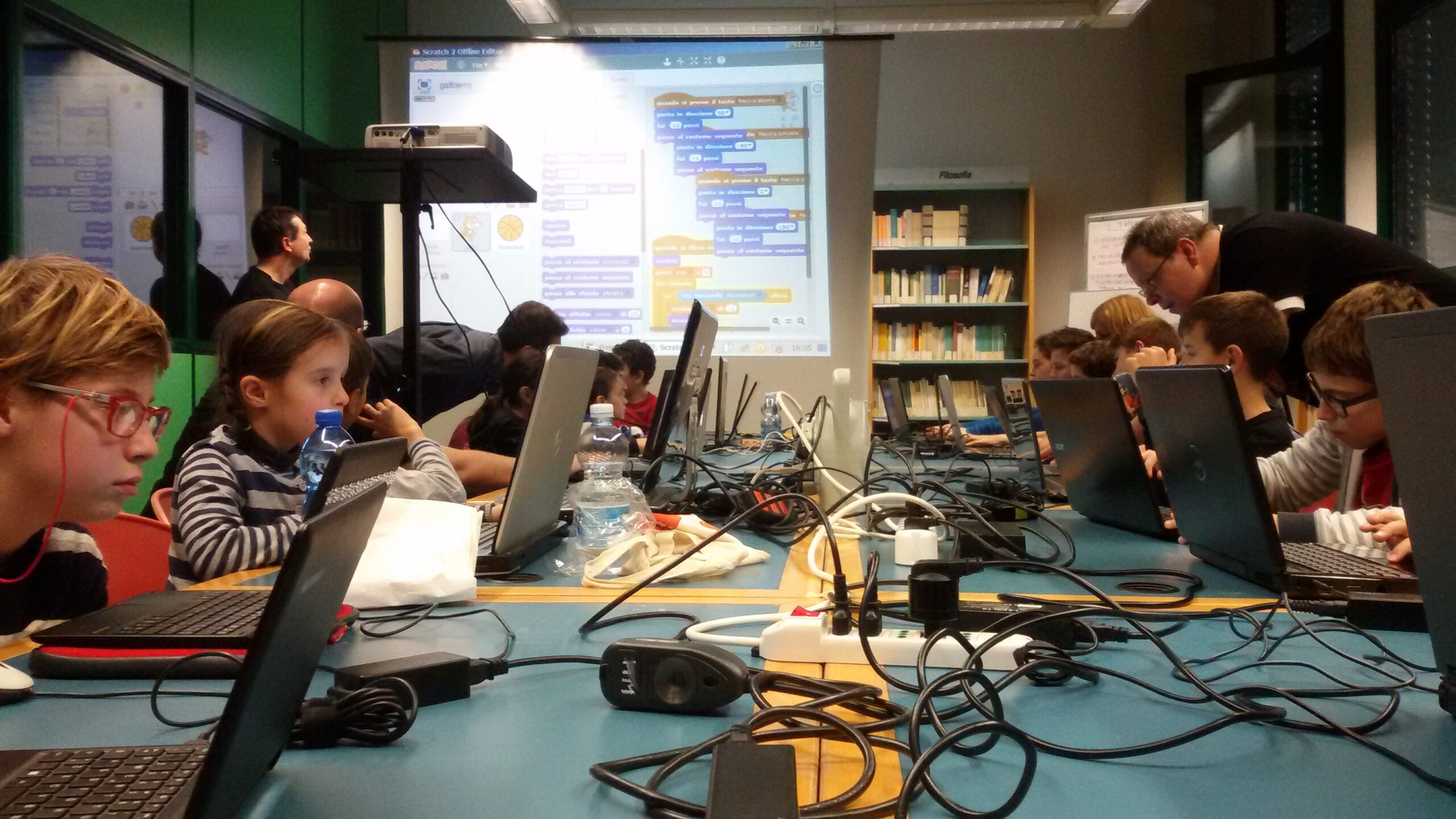 Dopo due eventi pomeridiani in biblioteca, il 18 febbraio siamo tornati alla scuola Ciari. L’evento si è svolto sabato mattina, dalle 9 alle 12, e hanno partecipato 15 bambini e bambine della scuola primaria. A differenza delle volte precedenti, nelle quali abbiamo creato dei giochi, questa volta l’argomento affrontato è stato lo storytelling con Scratch.