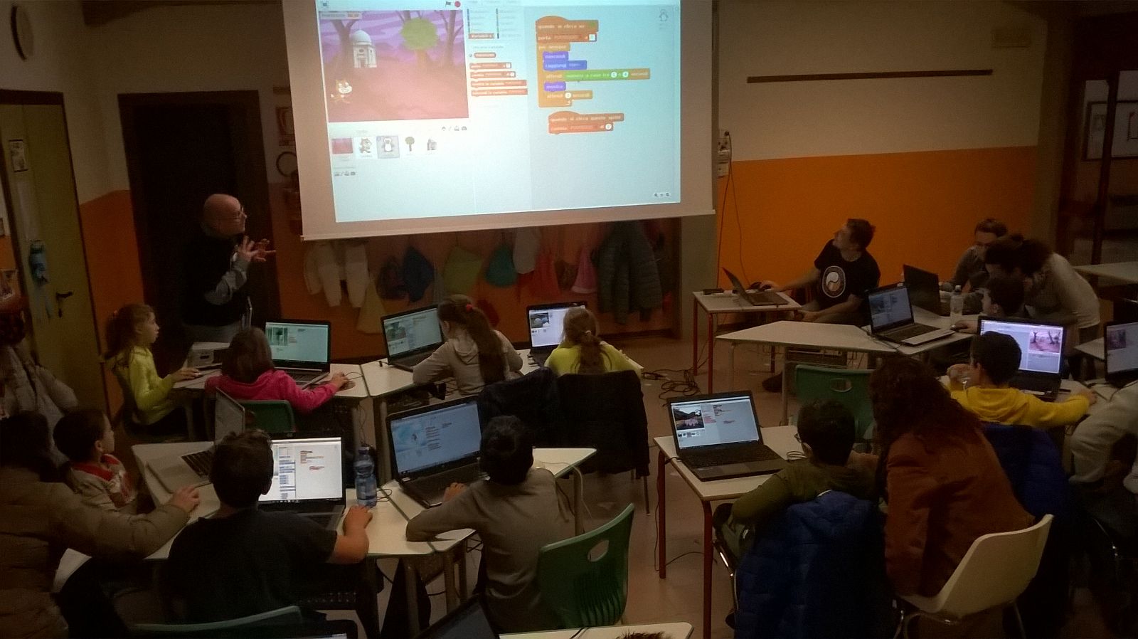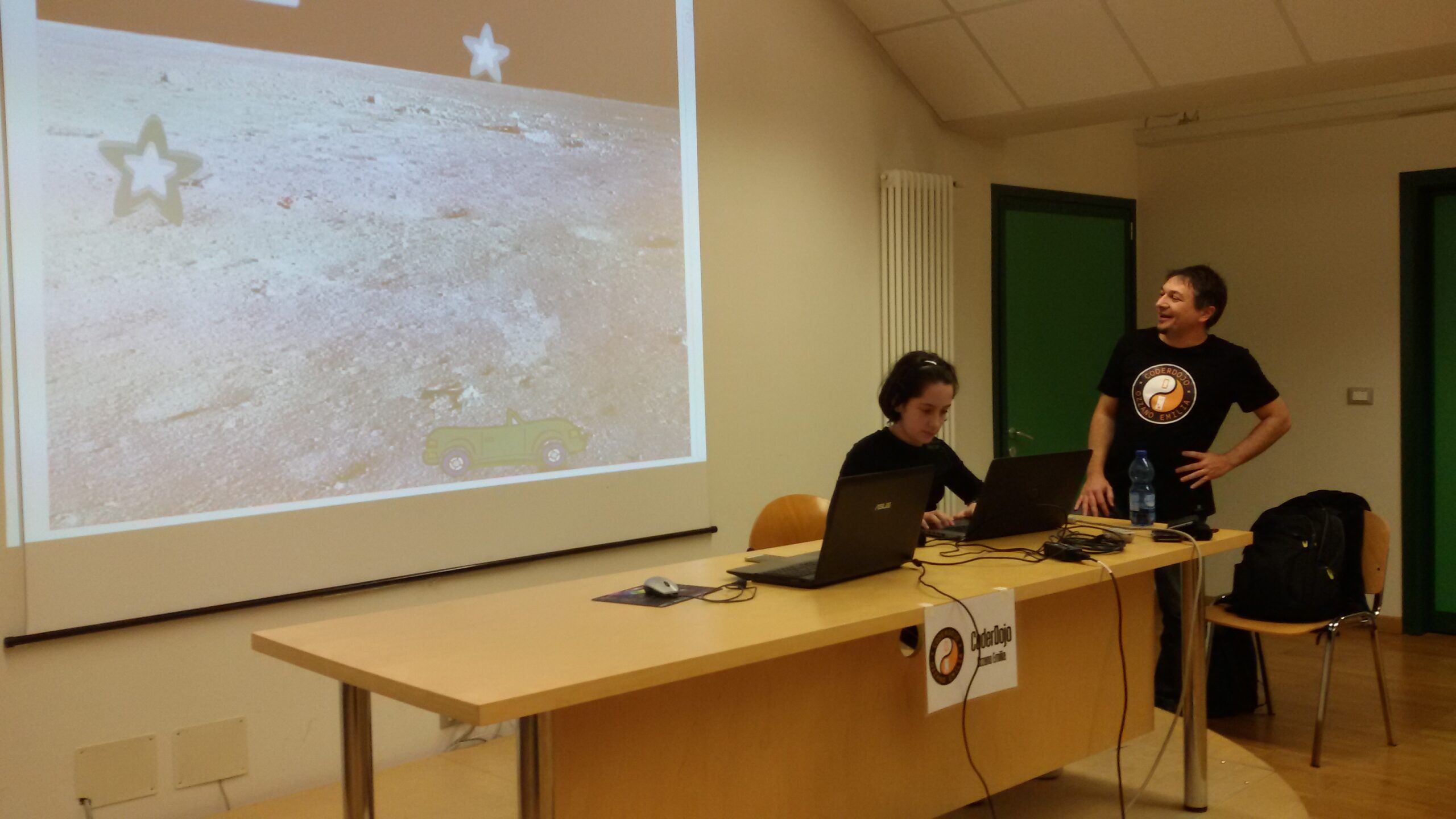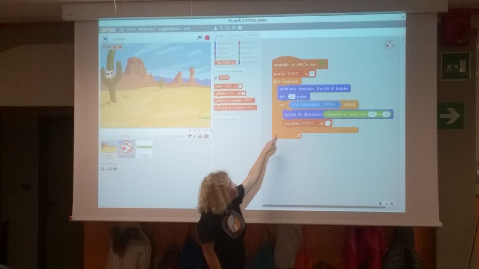 Una ventina di bambini di classi comprese tra la seconda e la quinta elementare hanno programmato, giocando, per tre ore, filate via come un lampo. Moltissimi di loro erano almeno alla seconda esperienza con Scratch e perciò abbiamo introdotto anche concetti avanzati e fondamentali, come le variabili. Il concetto di “variabile” è sicuramente difficile da far digerire ad un bambino, ma quando gli si mostra come usare una variabile applicata a qualcosa che conosce bene, all’interno di un videogioco (punteggio, vite, difficoltà, livello, velocità, etc), prende subito confidenza.