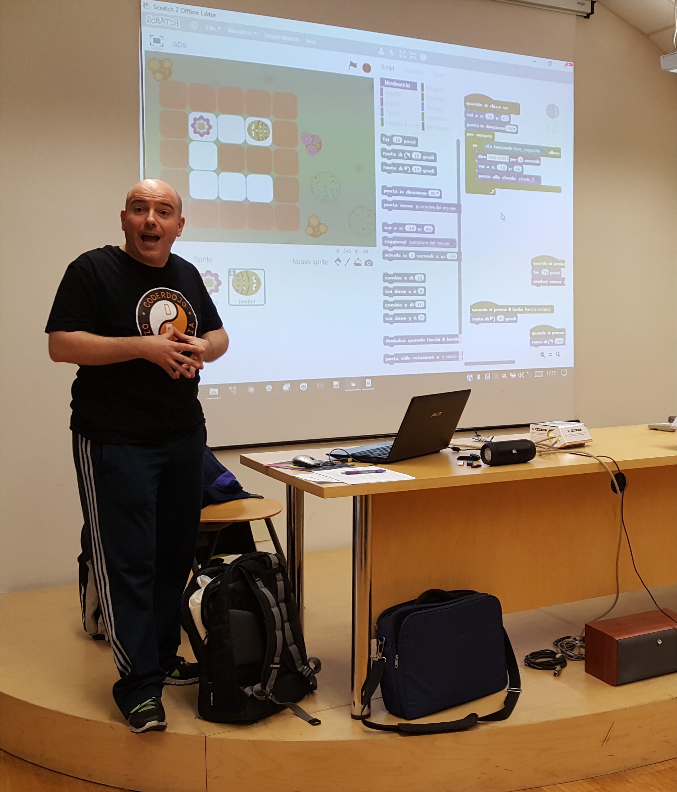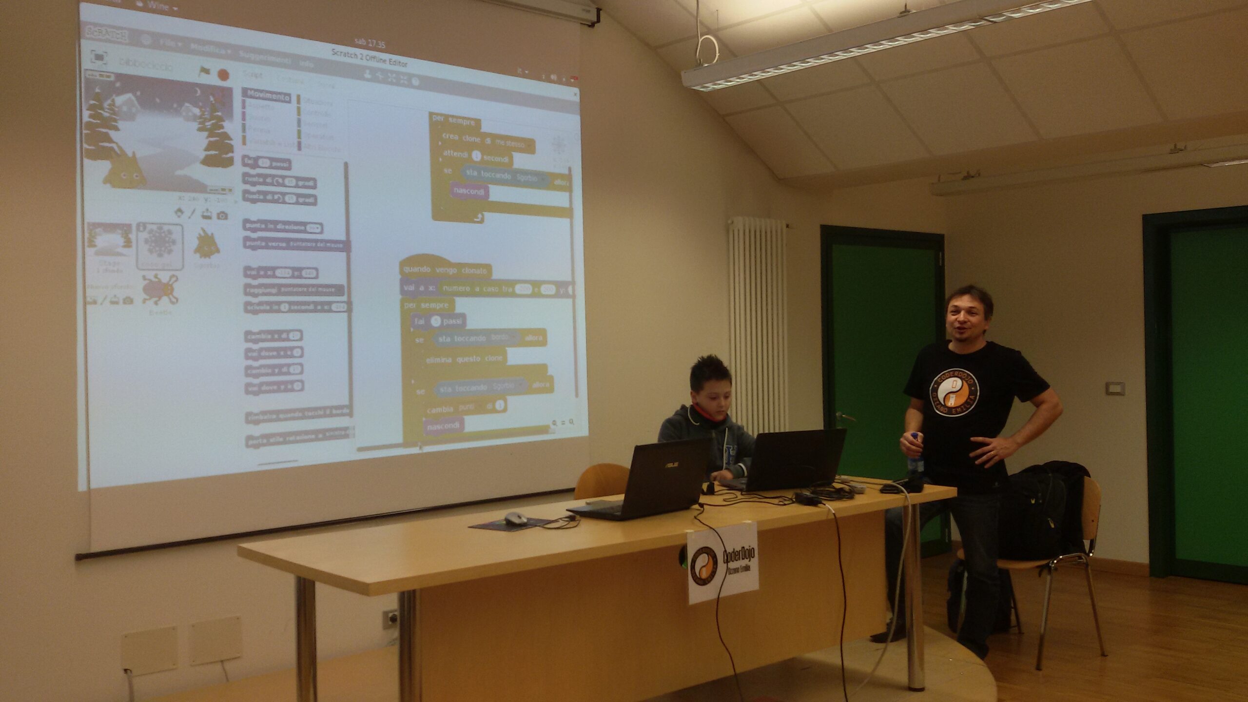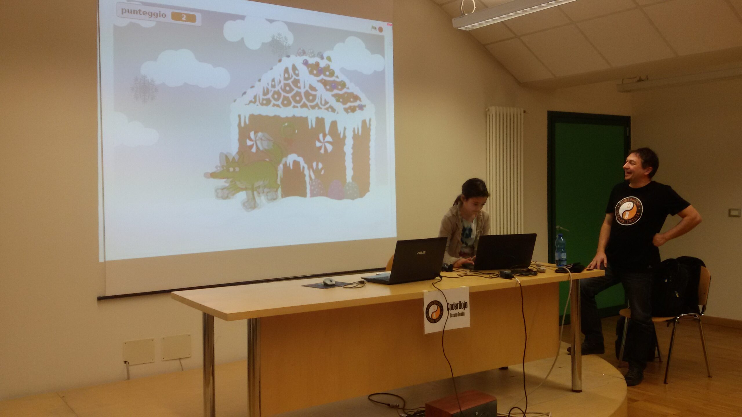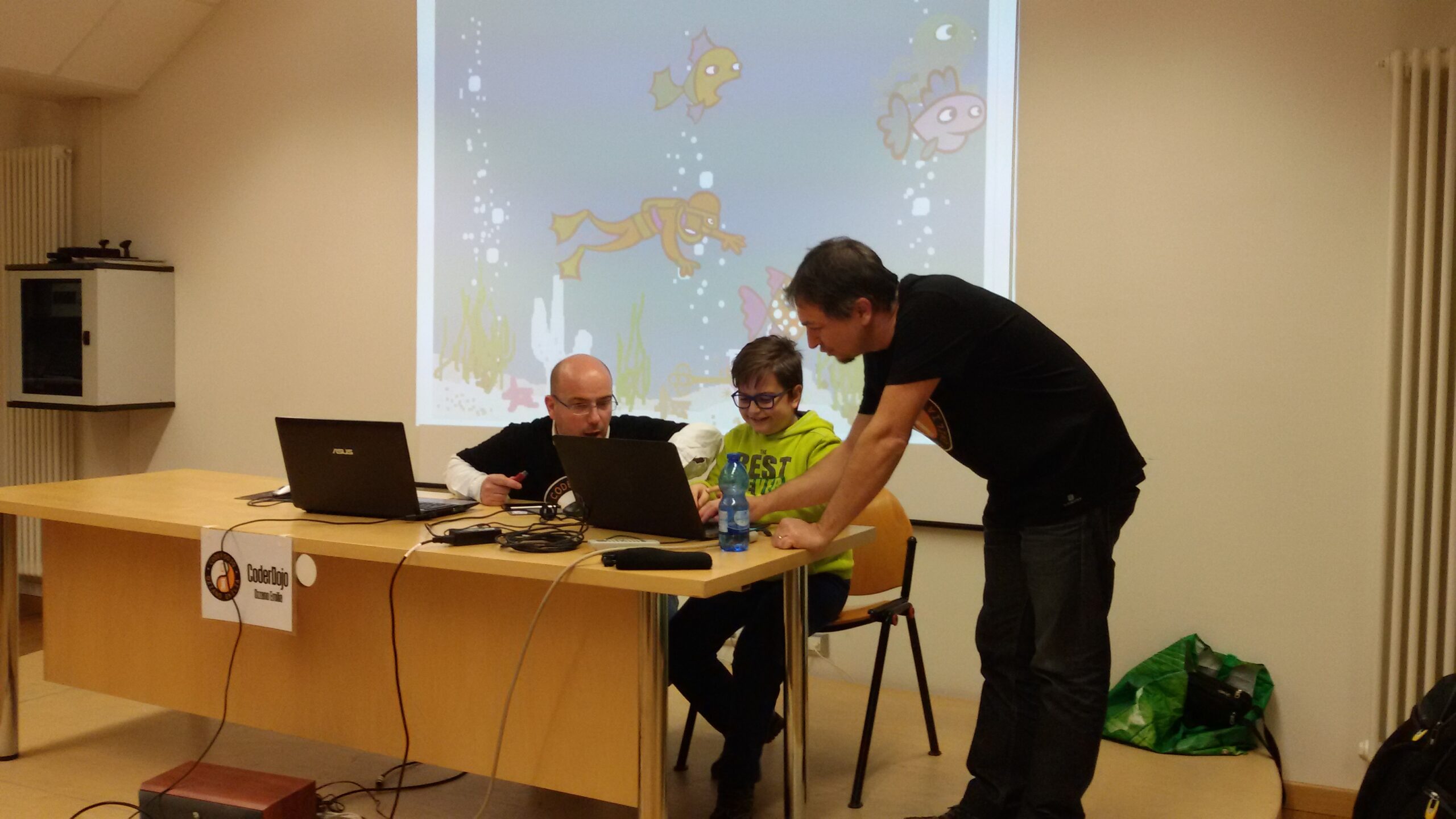Una ventina di bambini di classi comprese tra la seconda e la quinta elementare hanno programmato, giocando, per tre ore, filate via come un lampo. Moltissimi di loro erano almeno alla seconda esperienza con Scratch e perciò abbiamo introdotto anche concetti avanzati e fondamentali, come le variabili. Il concetto di “variabile” è sicuramente difficile da far digerire ad un bambino, ma quando gli si mostra come usare una variabile applicata a qualcosa che conosce bene, all’interno di un videogioco (punteggio, vite, difficoltà, livello, velocità, etc), prende subito confidenza.