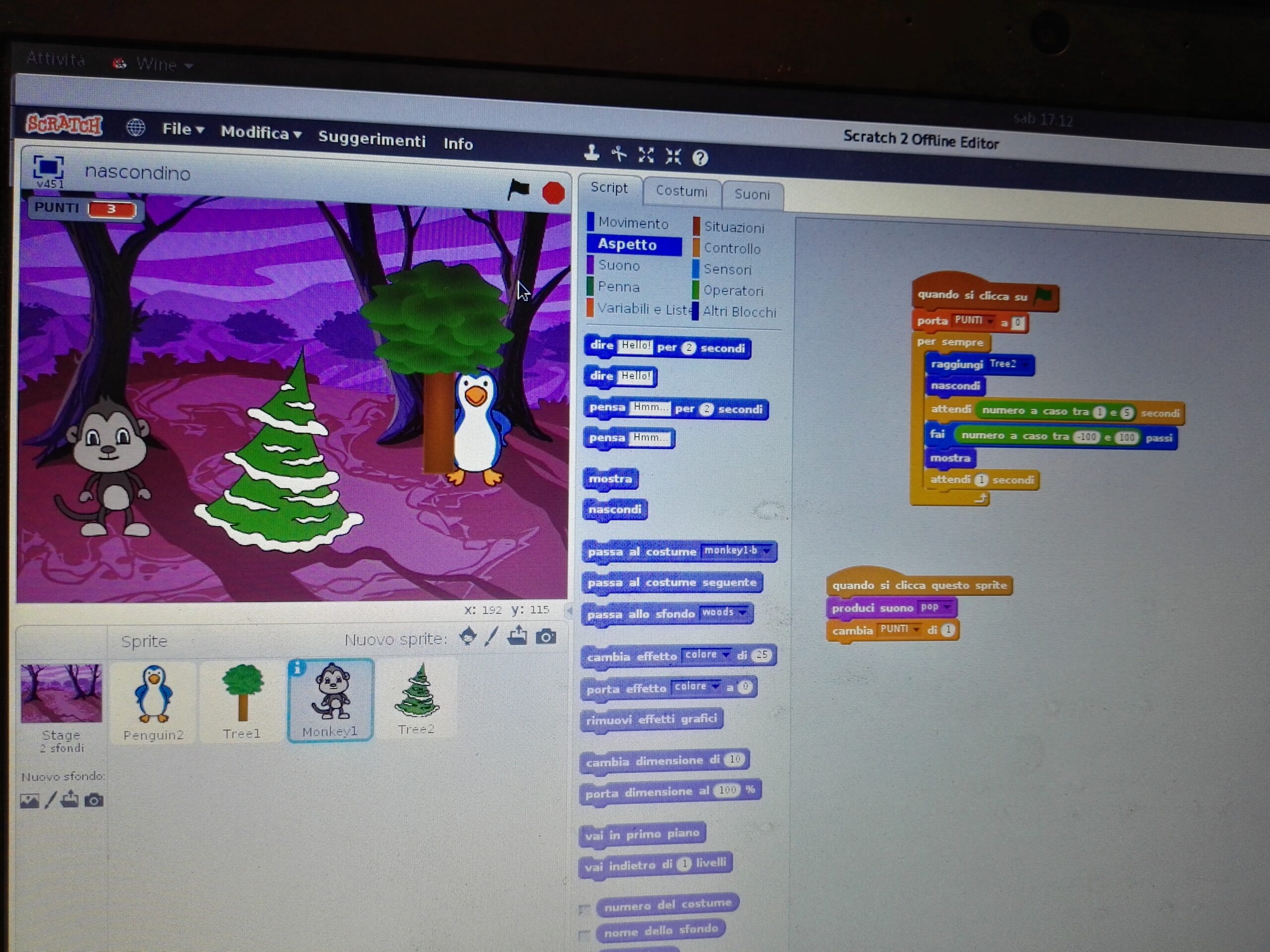 Immancabile la pinna di squalo, dopo la prima ora e mezza, per riuscire a staccarli dalla tastiera e fare una breve pausa … poi abbiamo ripreso cambiando completamente progetto: un altro bel videogioco in stile “hide and seek” da noi rinominato “nascodino degli animali”: simpatici animaletti dovevano nascondersi dietro oggetti piazzati a caso sullo schermo, per palesarsi ogni tanto, e se uno era veloce abbastanza per cliccarli quando erano visibili, aumentava il punteggio. E qui si son visti draghi nascondersi dietro nuvole, pinguini celarsi dietro mausolei, gatti sparire dietro alberi e tanto altro ancora 🙂