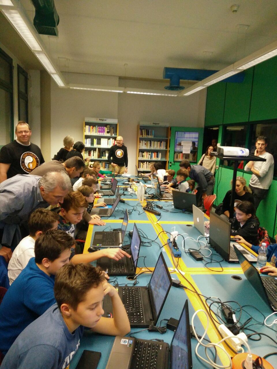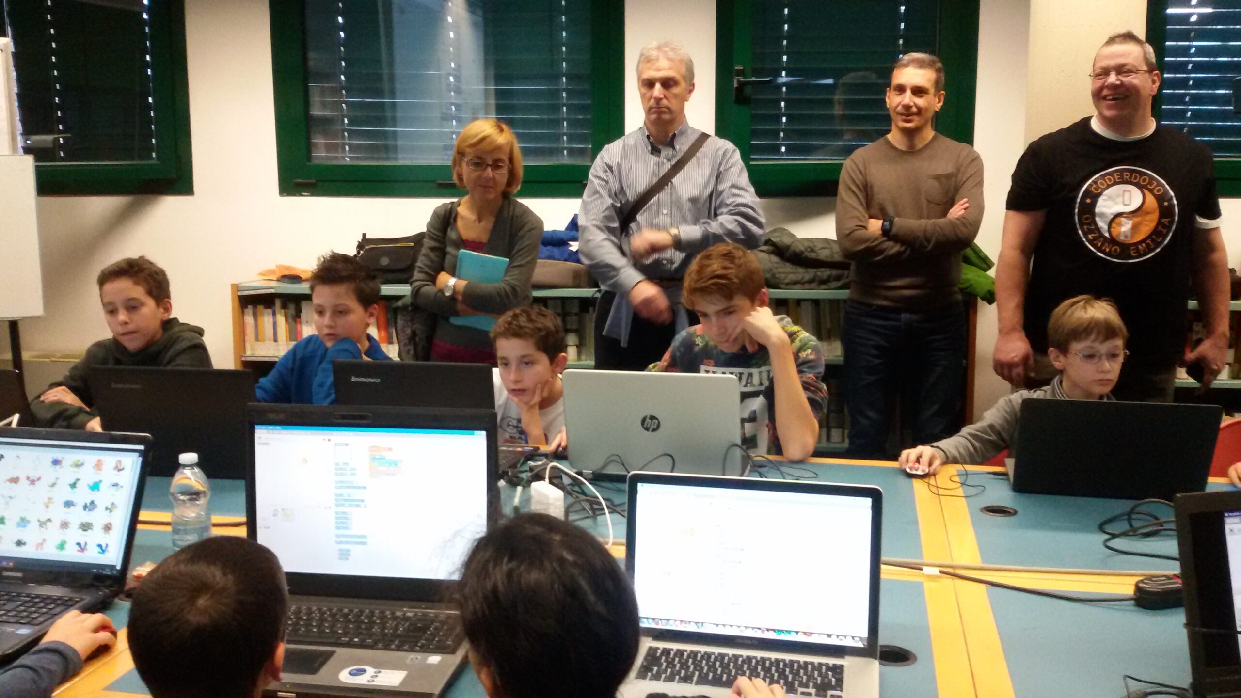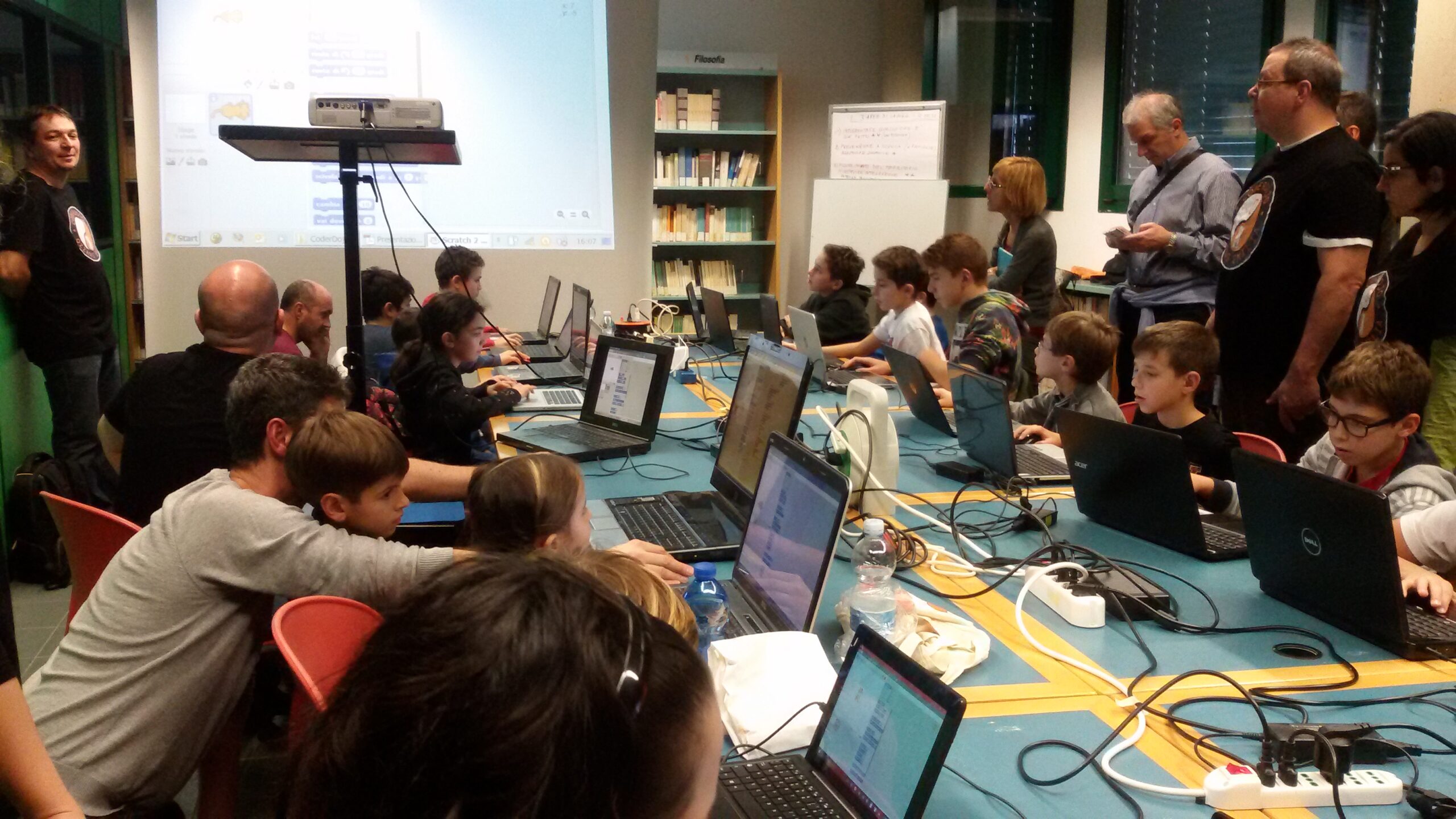 Bellissimo vedere tanti bambini/ragazzi, di età diverse, divertirsi e collaborare per realizzare progetti! Lo scopo del dojo è proprio questo: far sì che i nostri bambini si trasformino da utenti passivi (di videogiochi e smartphone) a utenti attivi, capaci di ideare e realizzare, programmando, i loro giochi … risolvendo, con pazienza e metodo, i problemi che si incontrano nella progettazione e programmazione, insieme!