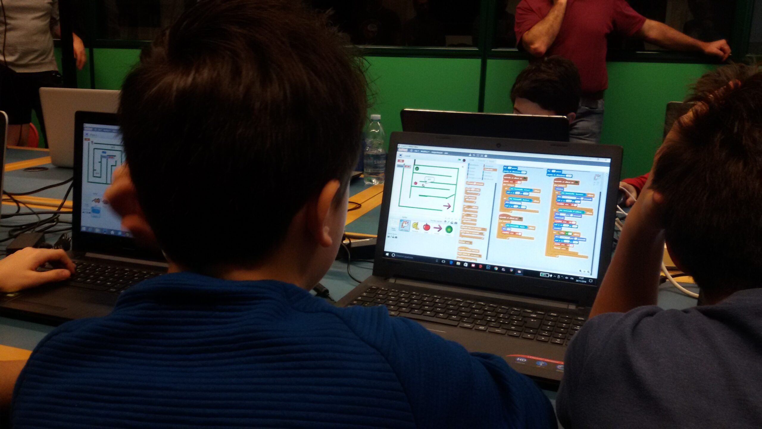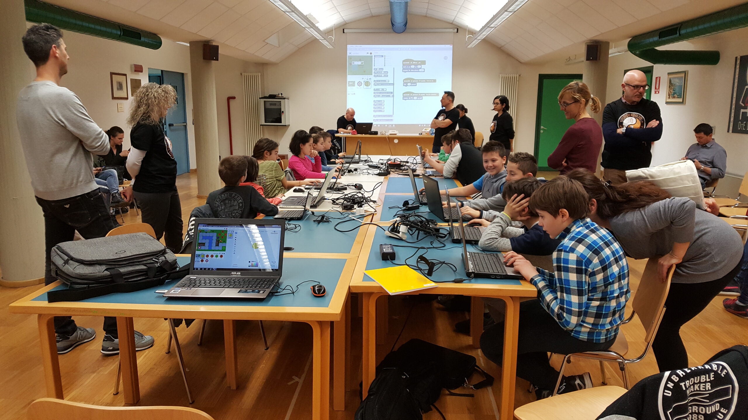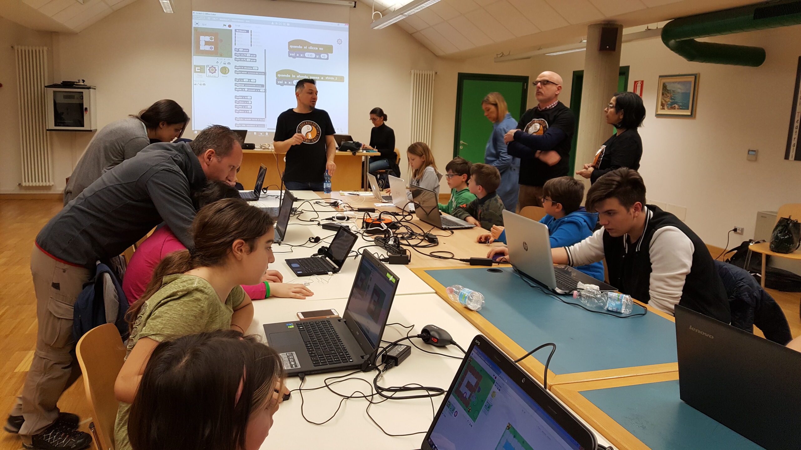 Bellissimo vedere tanti bambini/ragazzi, di età diverse, divertirsi e collaborare per realizzare progetti! Lo scopo del dojo è proprio questo: far sì che i nostri bambini si trasformino da utenti passivi (di videogiochi e smartphone) a utenti attivi, capaci di ideare e realizzare, programmando, i loro giochi … risolvendo, con pazienza e metodo, i problemi che si incontrano nella progettazione e programmazione, insieme!