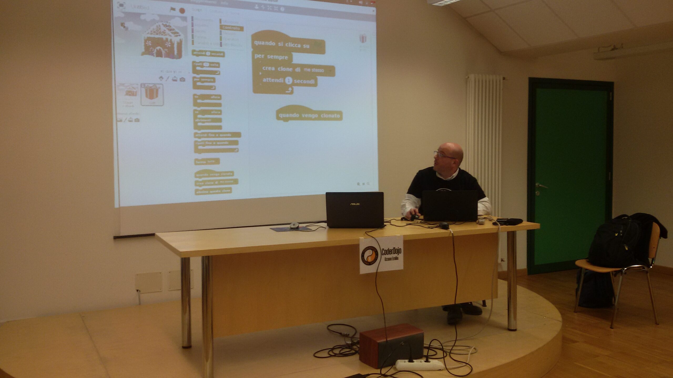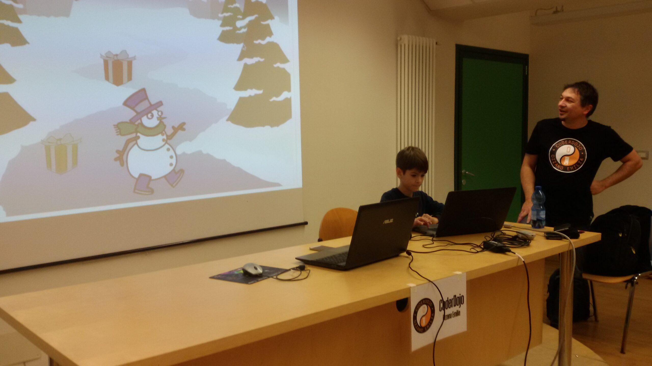 L’ultimo CoderDojo dell’anno si è svolto sabato 17 dicembre, dalle 15 alle 18, presso la Biblioteca comunale 8 marzo 1908. La sala si è dimostrata eccellente e ringraziamo nuovamente il Comune di Ozzano dell’Emilia, la Biblioteca e l’Istituto Comprensivo per averci dato la possibilità di usufruirne. Dei 20 bambini/ragazzi partecipanti, due provenivano dalla scuola secondaria di secondo grado, quattro dalla scuola secondaria di primo grado ed il resto dalla scuola primaria. Dopo un breve ripasso, durante il quale i mentor hanno affiancato soprattutto i bambini che partecipavano per la prima volta al dojo, è stato proposto un progetto natalizio con l’introduzione del cloning degli sprite. La base del progetto è stata muovere un pupazzo di neve per raccogliere dei regali che cadevano dal cielo; se il pupazzo ci riusciva, il punteggio aumentava, mentre se il regalo raggiungeva terra, il pupazzo perdeva una vita. Per ravvivare l’atmosfera c’era anche la neve che scendeva dallo schermo, e se un fiocco toccava il pupazzo … il pupazzo si ingrandiva!
