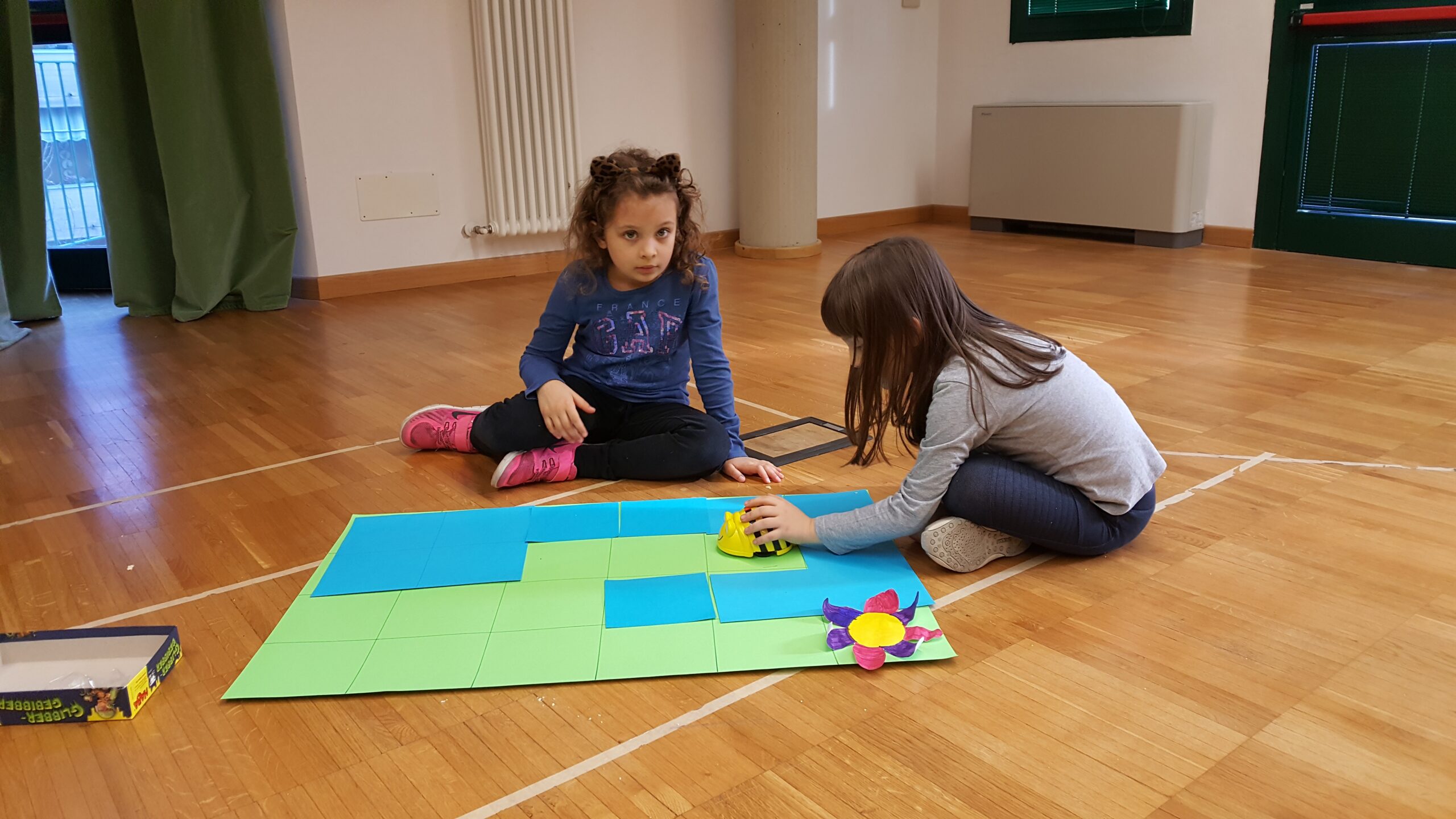 Per chi non le conoscesse, le BeeBot sono dei piccoli robot che vengono usati per insegnare la programmazione ai bambini molto piccoli, che non sanno ancora leggere e scrivere. L’obiettivo di queste apette è raggiungere un fiore (il traguardo) percorrendo un certo percorso su un tappeto, che abbiamo preparato con un cartoncino. Per riuscire ad arrivare al fiore, i bambini devono “programmare” l’ape, riuscendo così a capire molto bene (giocando!) il concetto di sequenza di comandi e loro esecuzione per raggiungere l’obiettivo.